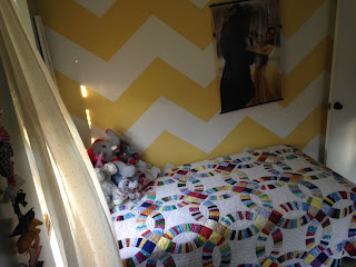 And though you had me wondering if you'd be going to kindergarten wearing diapers, you eventually got the hang of using a potty and wearing "big girl panties." I haven't changed your diaper for over a year. So we got rid of the dresser, exchanged it for a chest of drawers, and put it against another wall so you'd have more room to play. And where your dresser once stood now stands a twin bed, covered in a handmade quilt and topped with a dozen of your favorite elephants. This is where I read to you every night. Where you make room for me so I can lay down with you. You bounce on top of it and get that quilt all messed up. And you are actually getting a new quilt soon. With elephants on it. Purple, of course, since that's your favorite color. And my yellow chevron stripe? Over the summer, it will be painted purple, too, because that's what you chose.